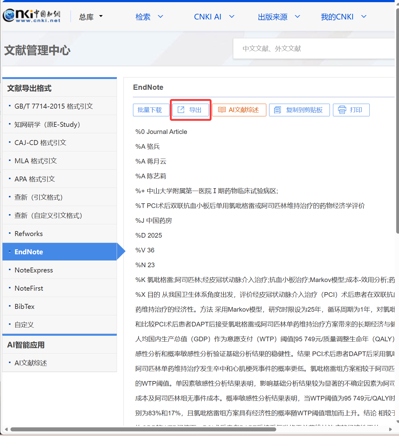 通过导出与分析-导出文献-Endnote按钮来获得Endnote的用于导入文献的内容