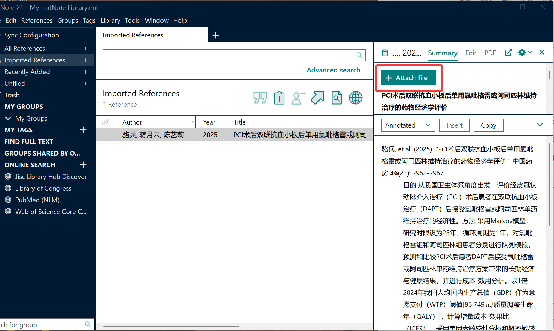 这时候已经成功导入文献了,如果你要连接pdf文件,请点击Attach File: