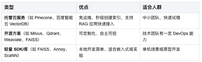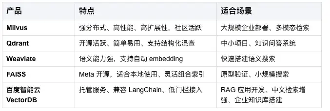 - 1B:建议选择具备强分布式支持的产品(如 Milvus、Qdrant、百度智能云 VectorDB 等)。