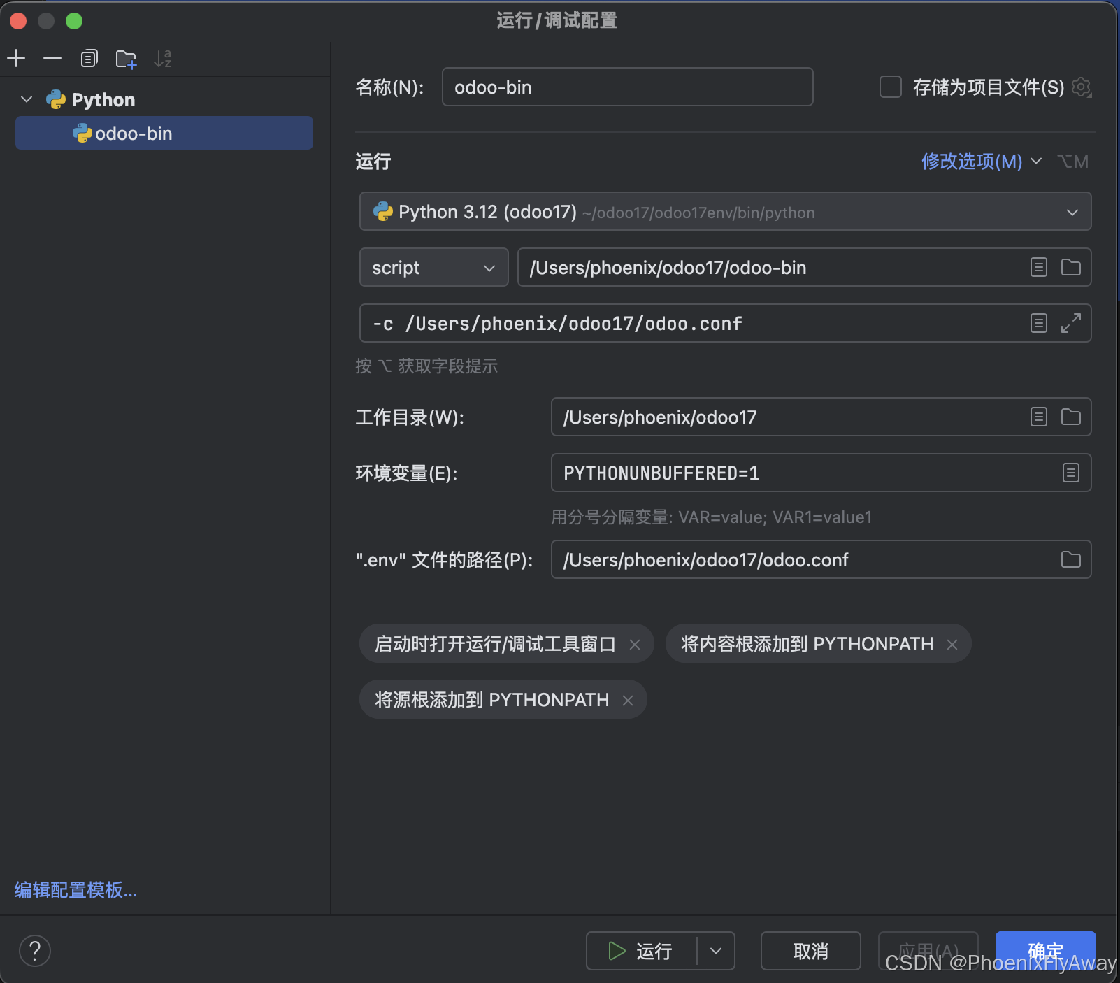 [options] addons_path = /Users/phoenix/odoo17/odoo/addons,/Users/phoenix/odoo17/addons,/Users/phoenix/odoo17/exte_addons db_host = 127.0.0.1 db_port = 5432 db_name = odoo17 db_user = phoenix db_password = xxxxxxx load_language = zh_CN log_level = info http_port = 8069 admin_passwd =xxxxxxx data_dir = /Users/phoenix/Library/Application Support/Odoo17 logfile = /Users/phoenix/odoo17/odoo.log