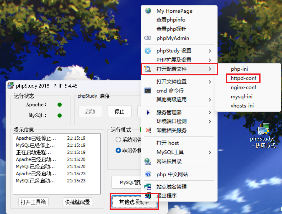 问题:这里如果使用的是v8.1版本的phpstudy的话,会发现即使修改了配置文件,还是访问不了我们上传的文件,在查阅了不少资料后发现,这是PHP版本与Apache版本不兼容,这里的版本指的是NTS(non thread safe非线程安全)和TS(thread safe线程安全)两个版本,8.1版本的phpstudy可以看到都是nts版本,但是nts版本的php不支持Apache的某些模块,导致我们即使修改了也无用,我们需要切换到ts版本的php