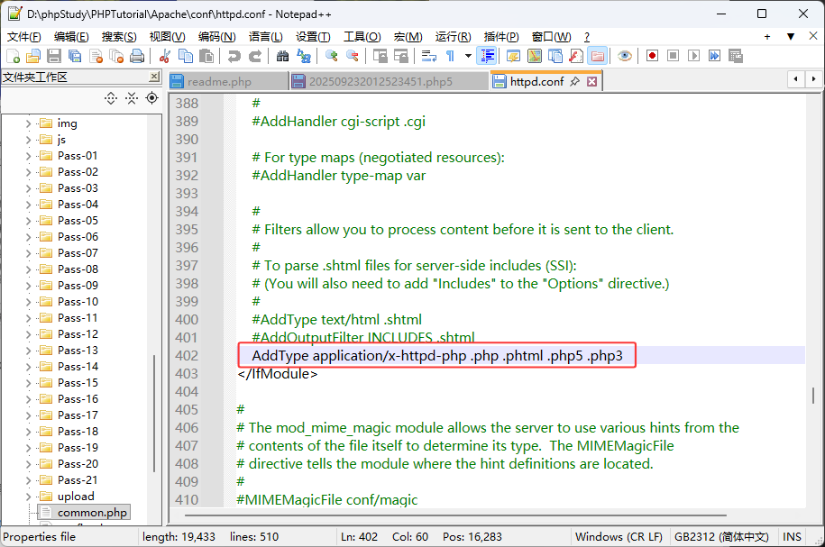 AddType application/x-httpd-php .php就是将以php后缀的文件交由PHP解析器去解析,这一关我们可以修改服务器的httpd配置来实现其他后缀文件也可以交由PHP解析器执行。