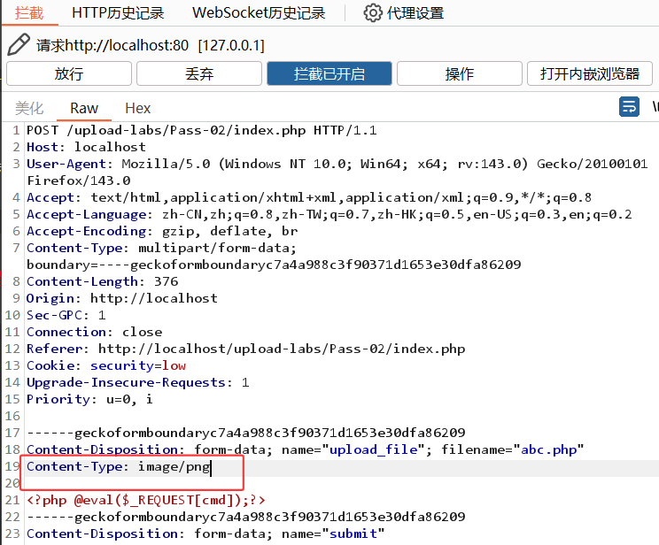 我们可以先抓取数据包,然后修改文件MIME类型,来绕过。我们使用Burp Suite抓包,修改Content-Type为image/png,再点击forward就可以成功上传了