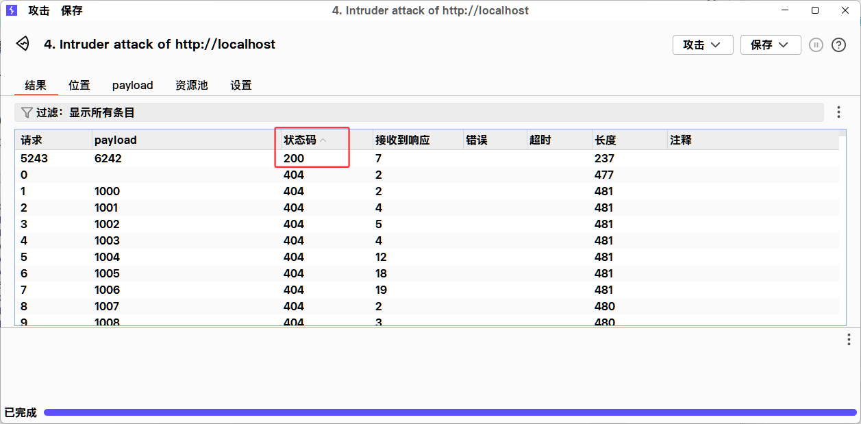 这里我们再给出使用burpsuite的方法,这个方法实测比python脚本快很多倍,几乎不到十秒就得到结果了,python差不多要跑一分钟左右。