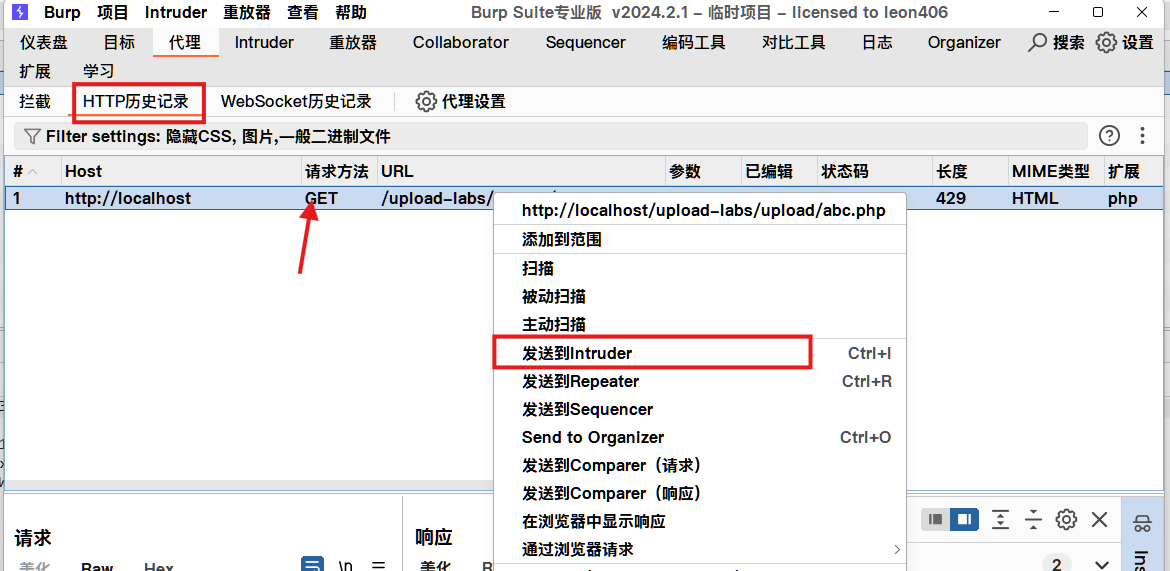 然后查看burpsuite的Proxy模块中带你开HTTP history,然后点开这个请求,右键点击Send to intruder