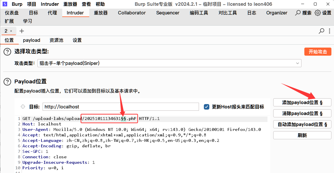 然后输入在浏览器查看到的时间,再添加Payload位置