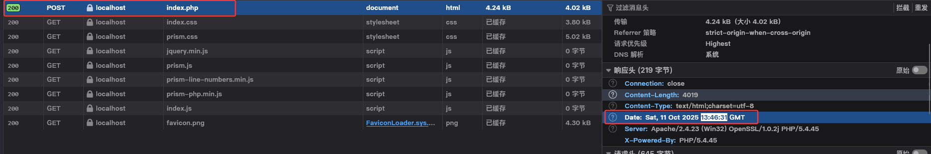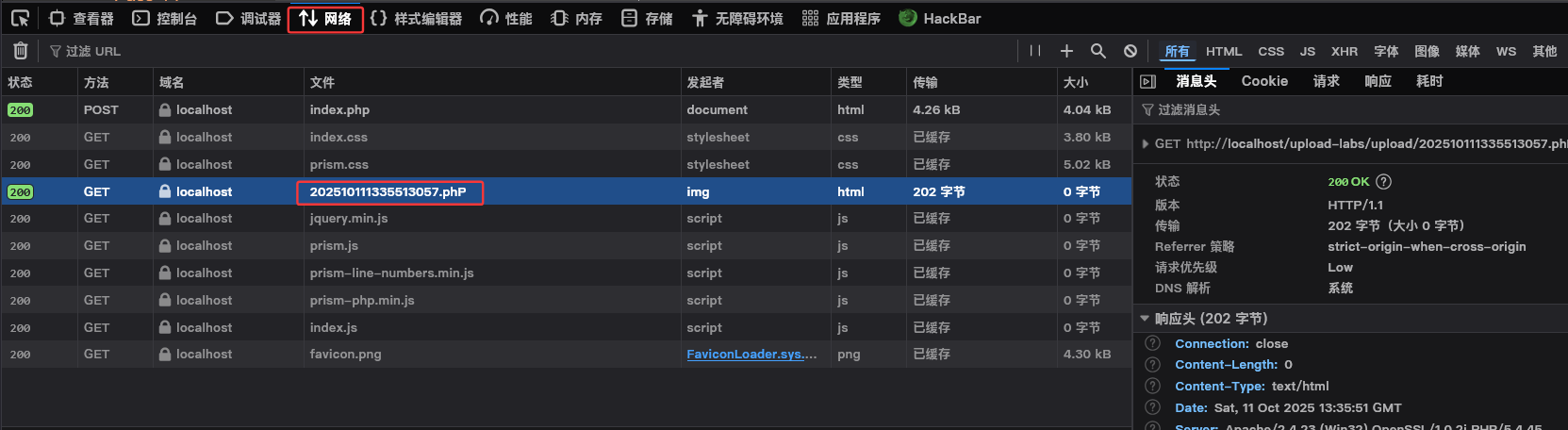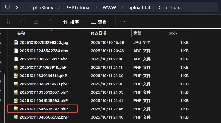 我们可以得到这个结果,可以看到6242payload的请求是成功的,也就意味着202510111346416242.phP这个文件是存在的,我们打开后端看一下,就是该文件。