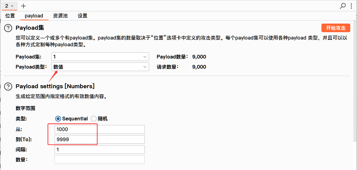 这里选择数值,然后输入区间,从多少到多少,这里因为服务端只从1000到9999,我们就输入这个,然后点击开始攻击就可以了