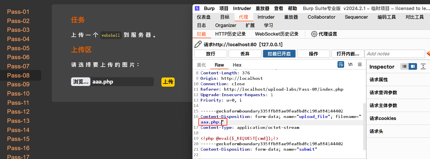 我们上传文件,利用burp抓包后修改文件名,在后面加一个“.”,来实现绕过。