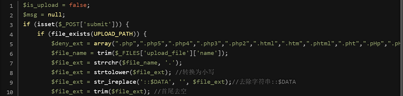 本关也是直接查看源码吧,发现还是过滤了很多后缀,过滤了大小写,但是呢,这里相较上一关没有deldot()这个函数,也就是没有删除文件末尾的点,我们可以利用特殊后缀来绕过。