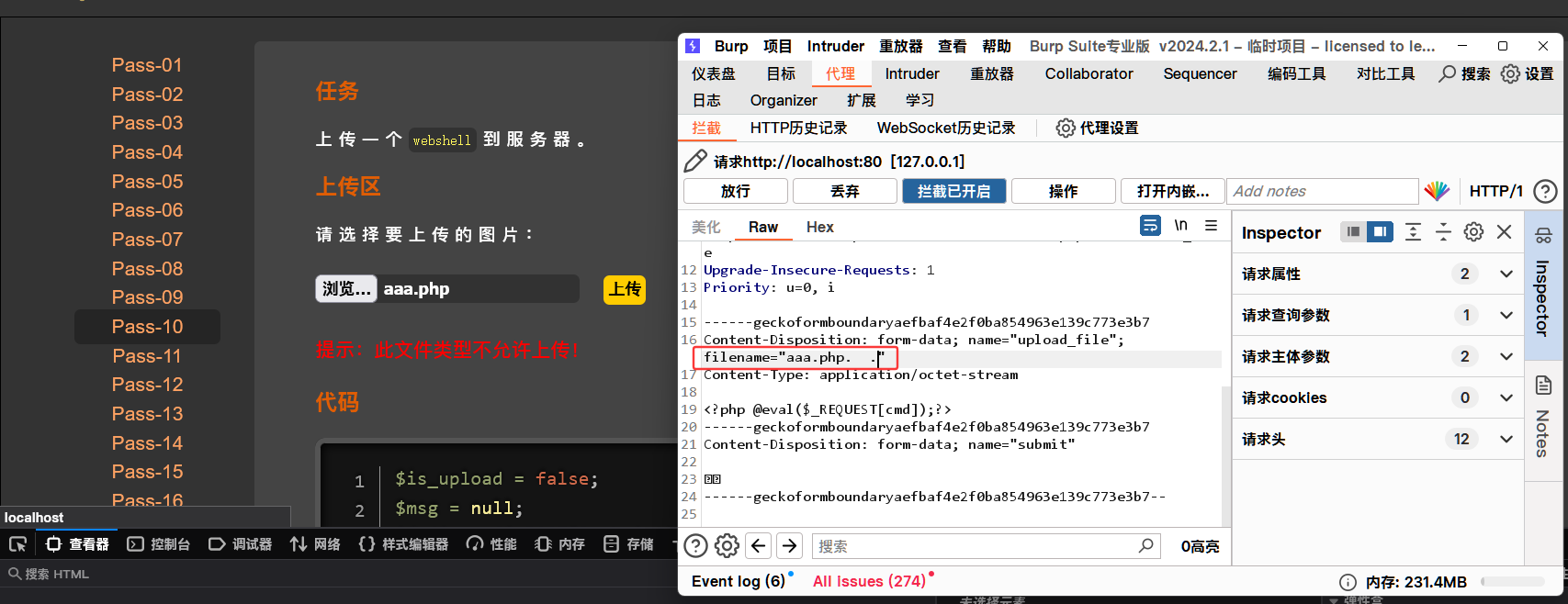 这里我们可以使用Apache的解析漏洞、00截断绕过以及特殊字符组合绕过,当然,这里重点介绍组合绕过。解析漏洞和00截断在之前的关卡使用过,后续也还有这类题目,我们多介绍一种思路。