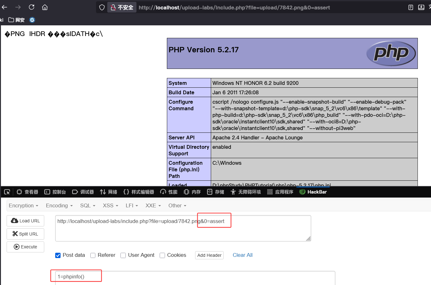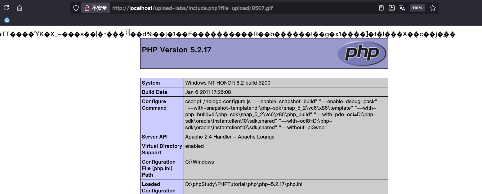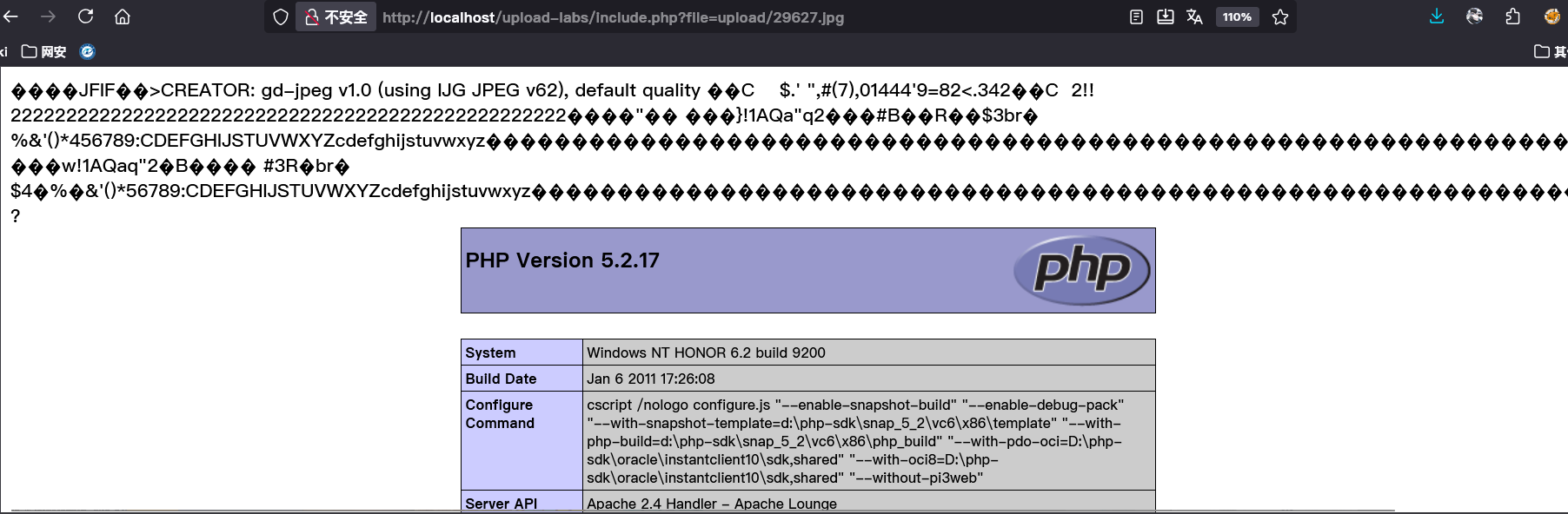 这里的payload是可以自定义的,这里就定为phpinfo()信息。这里我也是找了好多图片试,有的要么就是非jpg图片,可能是破坏了jpg图片标识,还有的可以上传,但是提示语法错误,解析不了,试到第7张才成功,所以说,还是要多试试,这个很容易失败。