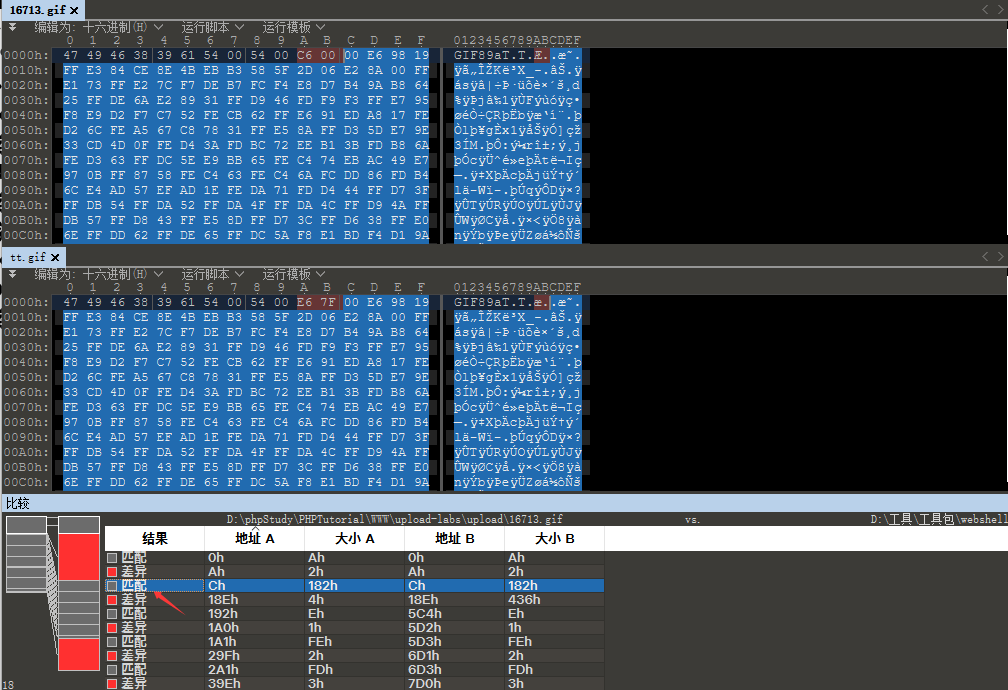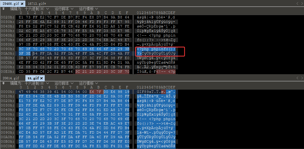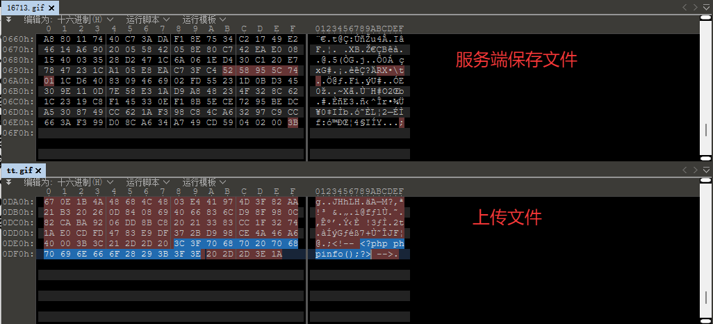 可以看到并没有输出想要的效果,我们的代码是<?php phpinfo();?>,理想效是还会输出php面板信息,由于二次渲染将我们的php代码给“删除”了,图片里面已经没有我们输入的php代码了。我们可以使用010编辑器来对比一下我们上传的文件和服务端存储的文件内容,可以发现服务端存储的内容里是没有我们的代码的。