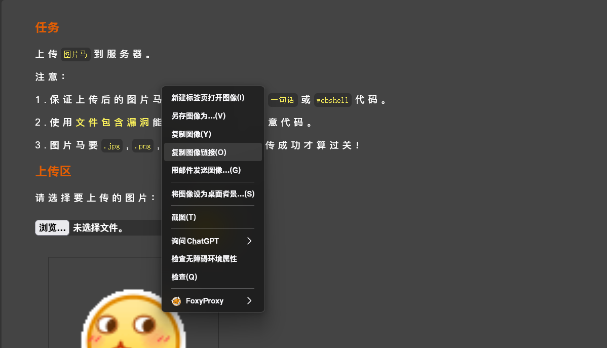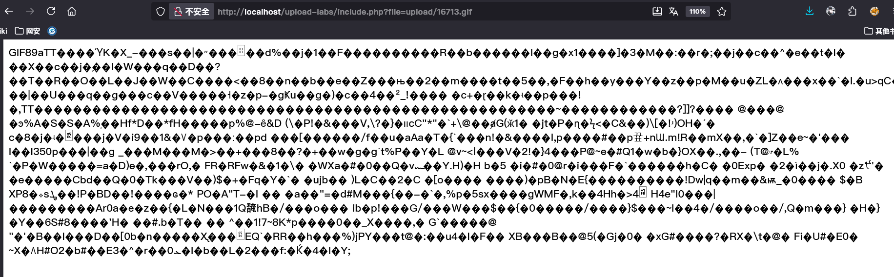 还是来实践一下看看吧。上传一张gif格式的文件,复制图像链接得到文件名,然后使用文件包含漏洞来访问这个文件。