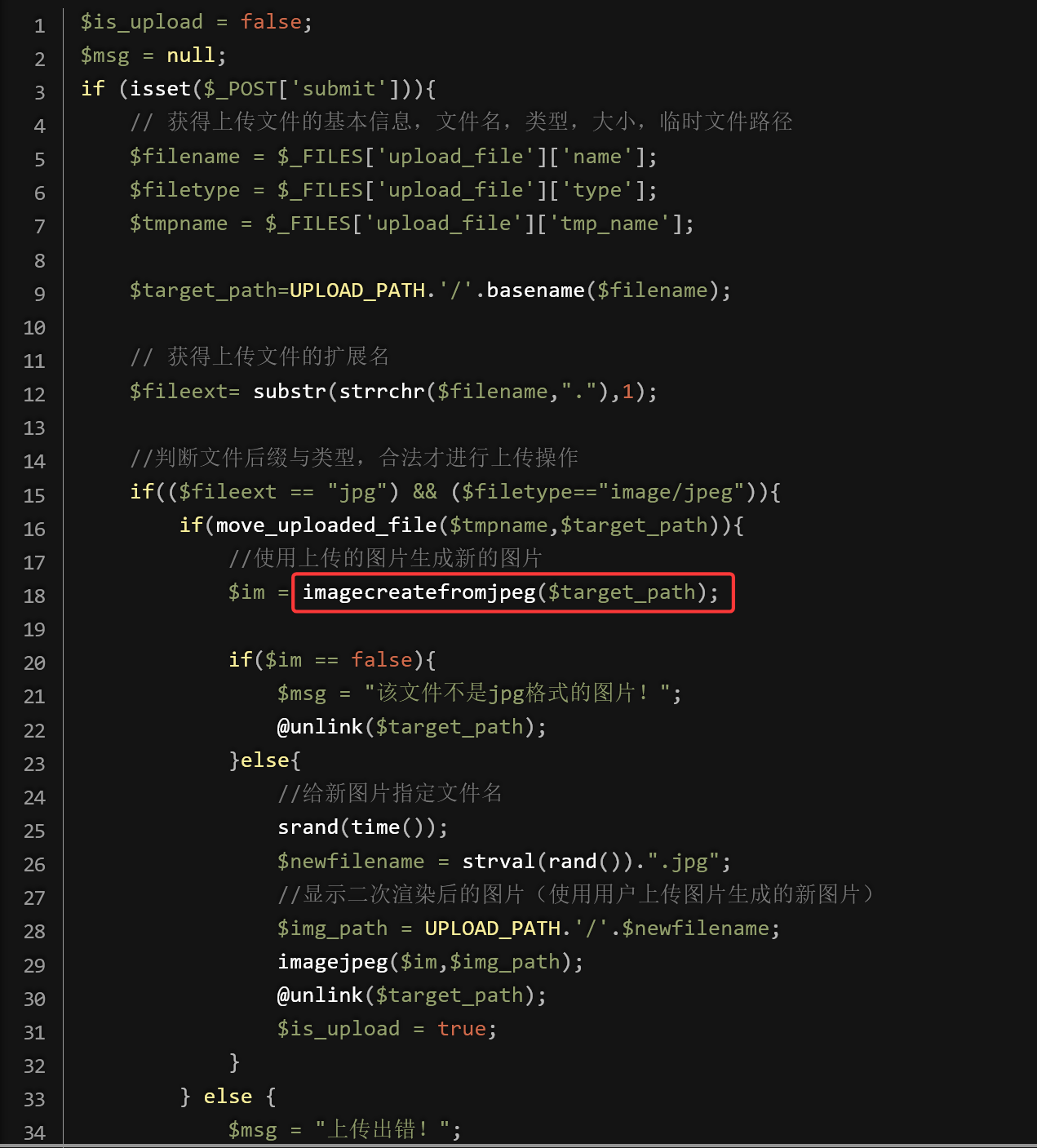 这一关相较于前几个图片马的关卡要难很多,涉及到二次渲染,源码中的imagecreatefromjpeg()和另外两个函数会读取我们上传的文件中的图像像素数据、色彩表、格式头 / 尾等核心信息,忽略所有不符合规范的内容(比如在图片末尾追加的 PHP 代码 <?php eval(...) ?>)。所以,我们想要绕过就得让二次渲染后的图片还包含我们的php代码。