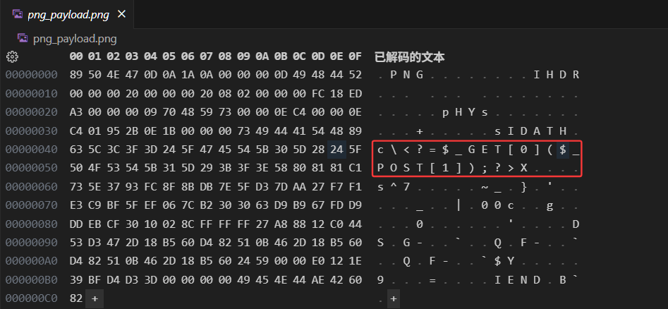 由于png图片有很多个块,绕过不能像gif那样直接修改。这里涉及到png图片的组成,这个详见【文件上传绕过】——二次渲染漏洞_二次渲染绕过-优快云博客,里面有详细的讲解。这里后面的解题脚本也是借鉴的这位大佬的。