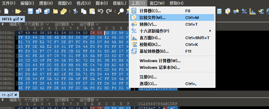 使用十六进制编辑器,我们比较一下内容变动的地方,打开010编辑器的比较文件功能,选择上传的文件和服务端保存的文件