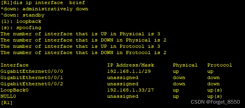 [R1-GigabitEthernet0/0/0]ip address 192.168.1.1 29