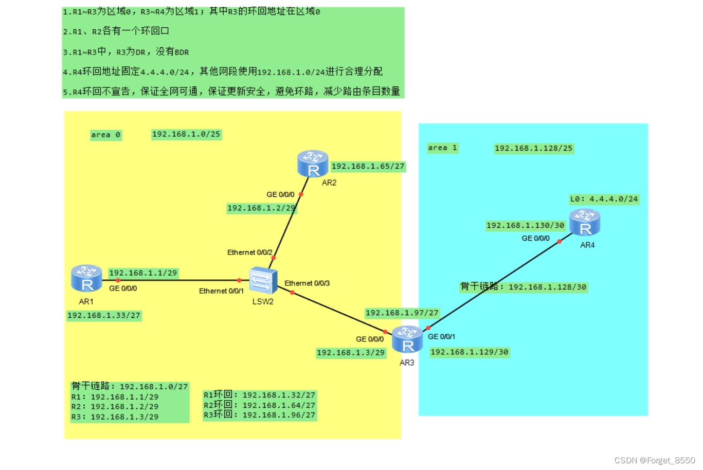 因为OSPF是区域划分网段的,所以区域1的网段为192.168.1.0/25,区域2的网段为192.168.1.128/25。