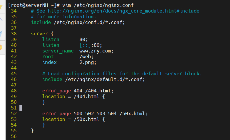 #编辑nginx主配置文件,修改listen——端口号为80;修改root——指定默认发布目录为/web,添加index——默认访问文件为2.png