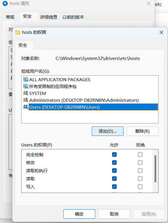#点击此电脑——进入C:\Windows\System32\drivers\etc——右击hosts文件——选择属性——选择安全——点击编辑——选择Users——勾选完全控制、修改、读写和执行、读取、写入——依次确定