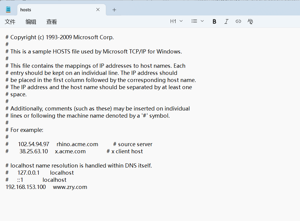 #用记事本编辑hosts文件,在最后一行添加域名解析,然后ctrl+s进行保存