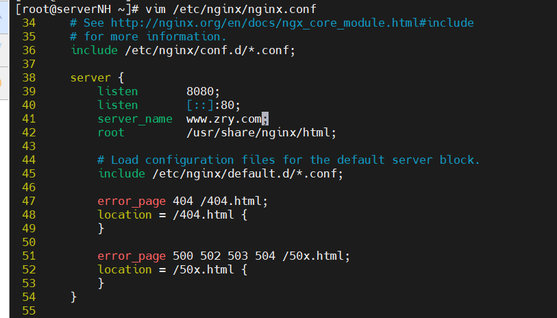 #编辑nginx主配置文件,修改listen——端口号为8080,修改server_name——监听域名为www.zry.com