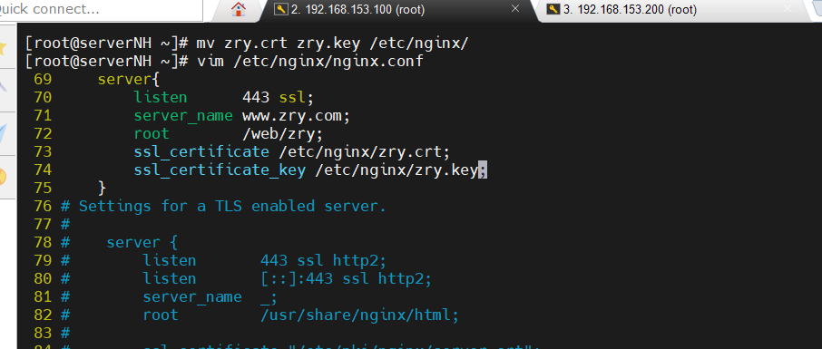 #将证书文件zry.crt和密钥文件zry.key移动到nginx配置目录/etc/nginx/中;编辑nginx主配置文件,添加基于https服务的虚拟主机,并绑定证书