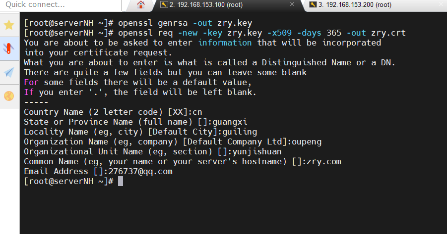 #创建非对称加密的密钥文件zry.key,通过密钥文件生成证书文件zry.crt,依次输入国家、省份、城市、公司(组织)、部门、服务器名、邮箱
