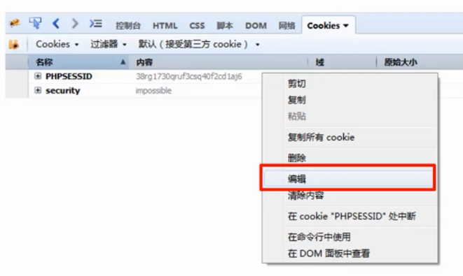 攻击者访问DVWA网站,,右击编辑phpsessid,填写之前获取的cookie