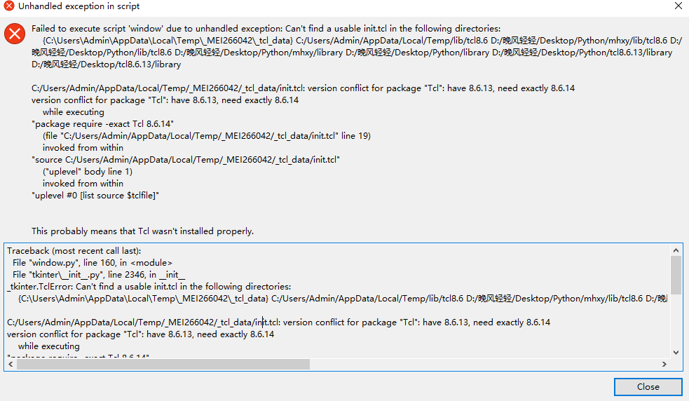 虚拟环境安装的 Tkinter 是 8.6.13,但是使用Pyinstaller打包时加载的库却要求是8.6.14。