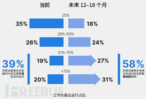 数据显示,当前企业组织工作负载迁移至云端的速度有增无减 。39% 的受访者表示已将超半数工作负载迁移至云端,与此同时,58% 的组织计划在未来 12‒18 个月内达成该目标。