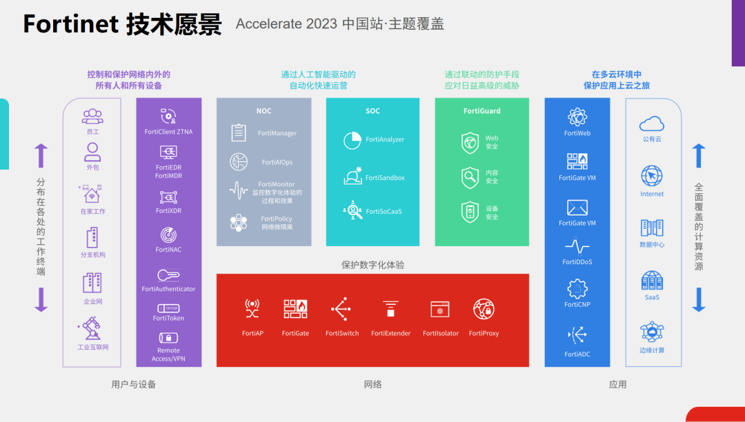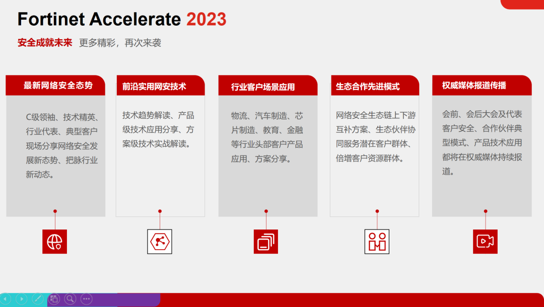目前,全球超 635,000 家用户已成功实现 Fortinet 全面融合解决方案和整合安全产品的全面部署。Accelerate 2023会议最新发布的内容,再一次表明Fortinet持续贯彻融合与整合理念的不变初心。下一步,Accelerate 2023将登录中国,开启全国15城巡回路演!Fortinet将再接再厉,继续引领行业发展,推出更多前沿创新解决方案,携手广大用户与合作伙伴,共同实现蓬勃发展,敬请期待!