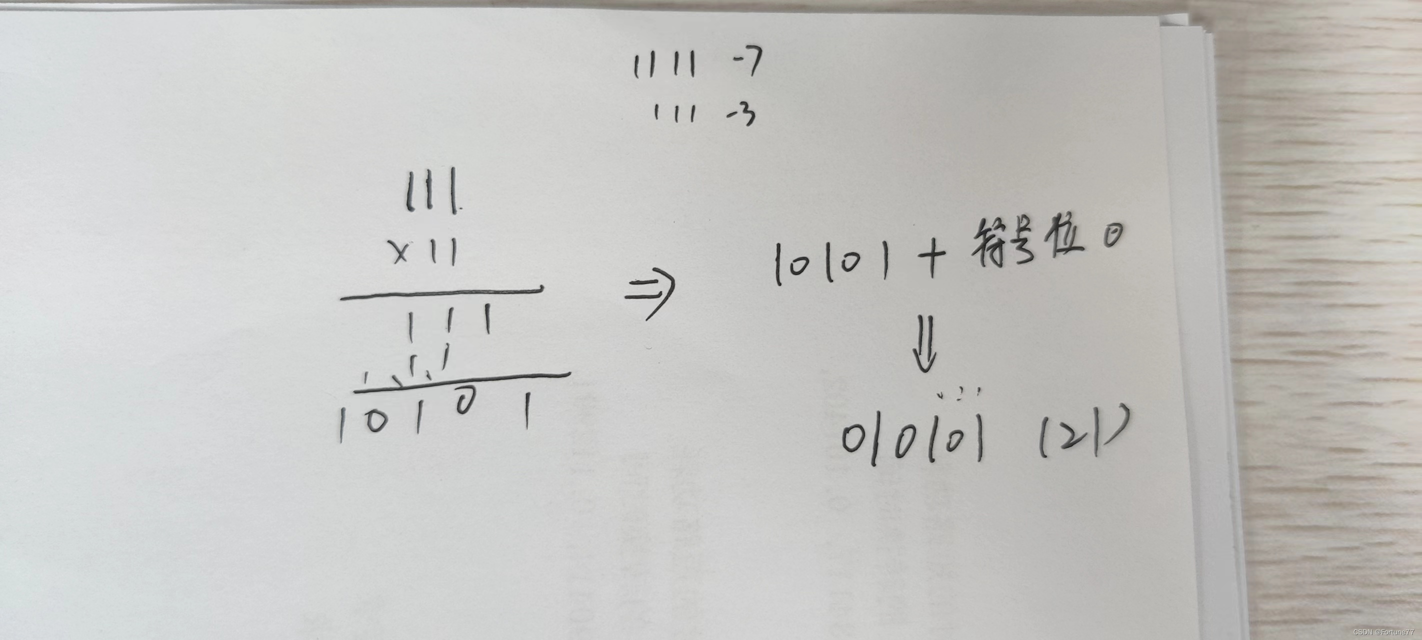 先不看符号位,算非符号位乘法,符号位单独计算,对于M*N位宽的,计算结果为M+N。以1111×111为例: