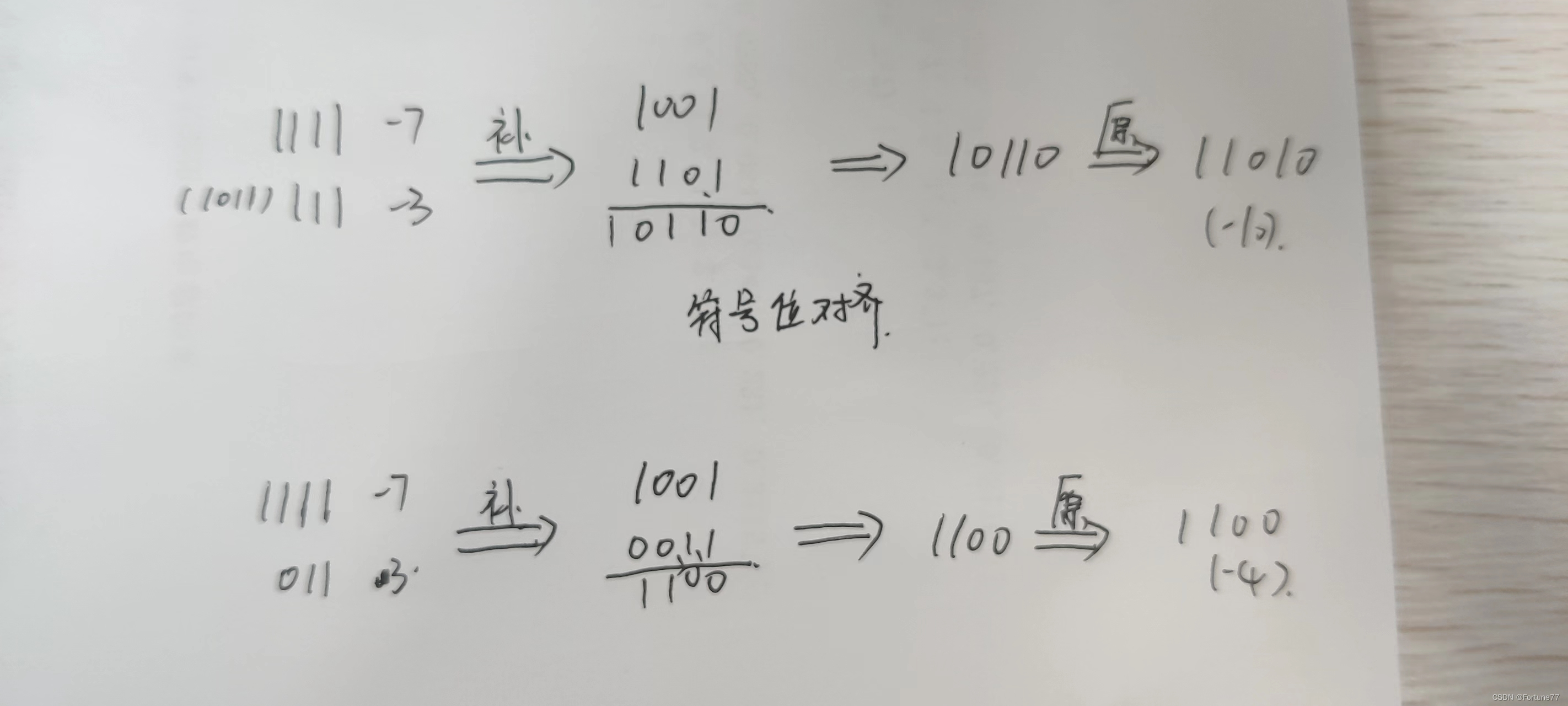 对于有符号数加法,需要确定的是结果的位宽和符号位对齐,以1111+111与1111+011为例子: