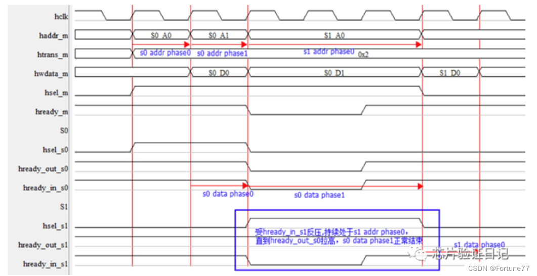 以如下的这个图为例,当S0和S1选择交换的时候,reg_hsel信号会延一拍,所以此时采到的值为S0的hreadyout,这个时候系统总线的hready信号拉低,reg_hsel不变,直到S0的hreadyout拉高,这个时候系统总线中的hready为高,恢复正常通信。整个过程可以看成是所有slave的hreadyout信号相与的过程,就是系统中只要有hreadyout信号为低,那么总线上的hready信号就是低。