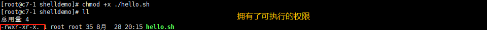 给shell程序赋予执行权限: chmod +x ./hello.sh # 使脚本附有权限