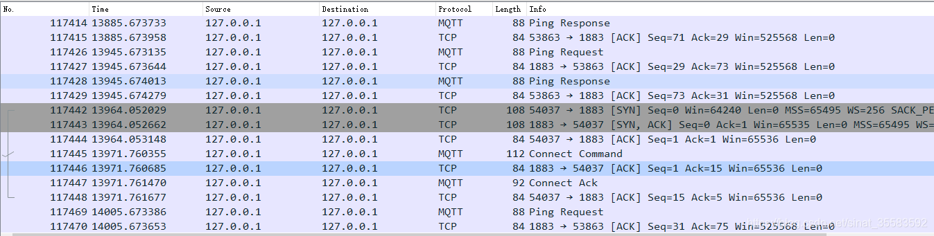 第二天. 在亲爱的度娘上看到你这篇文章:https://www.cnblogs.com/lvdongjie/p/6110183.html 瞬间明白了, 原来这是计算机的网络通信机理, 不是软件有问题, windows系统没有提供本地回环网络的接口,用wireshark监控网络的话只能看到经过网卡的流量,看不到访问localhost的流量,因为wireshark在windows系统上默认使用的是WinPcap来抓包的,现在可以用Npcap来替换掉WinPcap,Npcap是基于WinPcap 4.1.3开发的,api兼容WinPcap。仿佛看到了一丝希望, 找着教程, 终于能看到三次握手的信息了, 如下图所示: