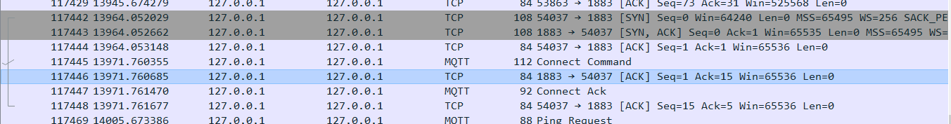 问题二: 当我用mqtt.fx连接服务器时, wireshark中protocol中一直显示tcp, 该栏目中表示wireshark中自动帮我们根据包的结构解析出协议的类型, 为什么一直时tcp, 不应该时mqtt吗?(忽略上图的mqtt字母, 这是我成功后的图)