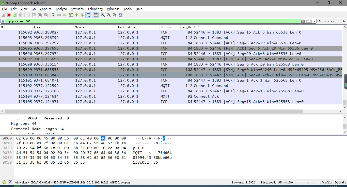 no: 为包的顺序, time为抓包的时间, source为包的来源ip地址, destination为包目的ip地址, 这里因为都是本地发送接受的, 所以都为127.0.0.1 protocel为软件解析出包的协议属于的类型, length为包的长度, info为包的信息: 看到54037 - 1883了吗? 这表示是客户端向服务器发送的数据, 剩下的一些信息等我们讲解协议的时候再讲解吧, 今天先这样吧, 我再看看mqtt文档协议