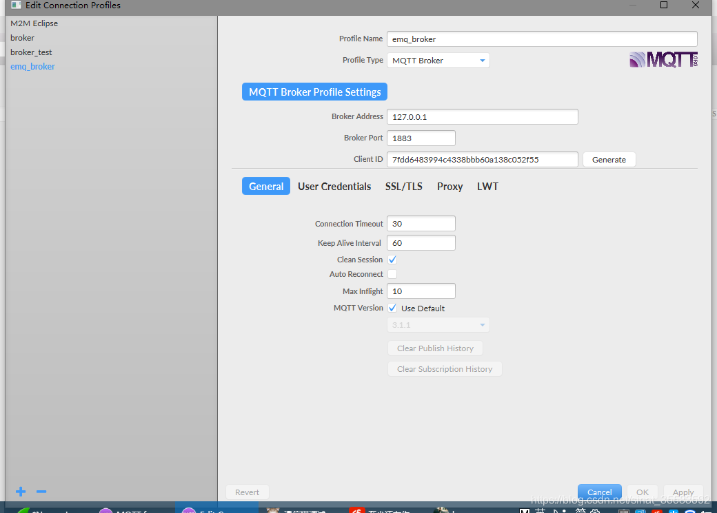mqtt.fx安装也很简单, 下载地址: http://www.jensd.de/apps/mqttfx/1.5.0/ 使用教程:http://blog.sina.com.cn/s/blog_45eaa01a0102xam3.html 来一张我得配置图和连接图吧