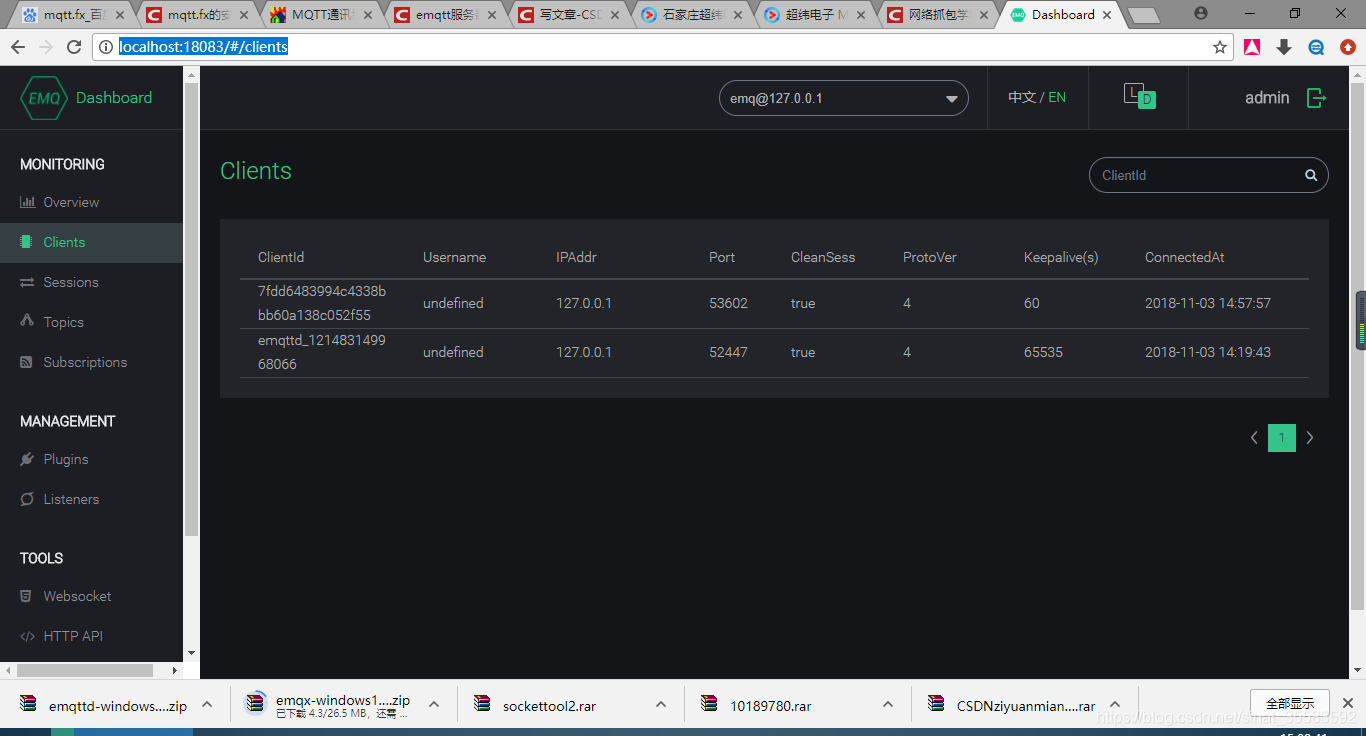 如果连接成功了刚刚搭建的服务器, 上图的红色框中圆圈是绿色的, 没连接成功就是红色的, 在emqtt的服务器控制台, 也就是网址:http://localhost:18083/#/clients 能看到客户端信息