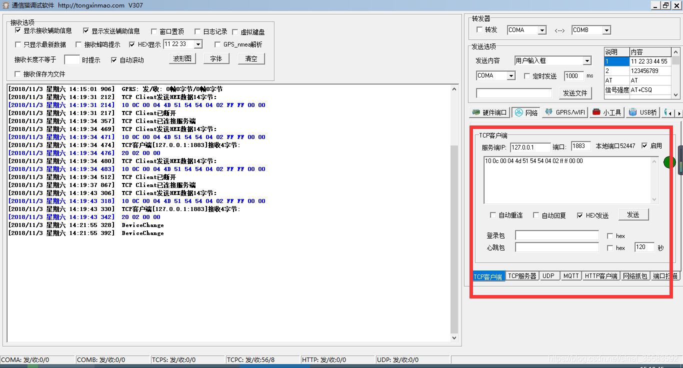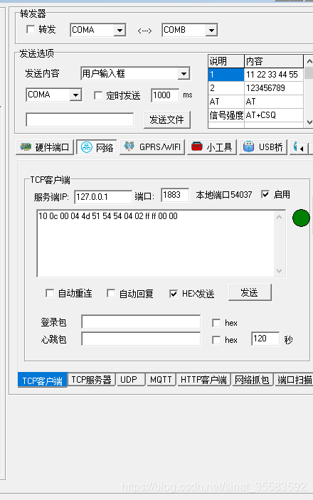 有这么多的tcp调试助手, 为什么选择他呢, 一是因为它发送数据的时候有hex进制发送, 因为mqtt协议的包都是要求16进制发送的, 通信猫还有其他的好多功能, 自己用了就知道, 我就不在这帮他打广告了, 通信猫下载地址:http://www.tongxinmao.com/Topic/Detail/id/6 关键还是绿色的, 就喜欢绿色的软件了, 不要时直接卸载文件夹, 这里没坑, 解压就行了, 附一张通信猫的图: