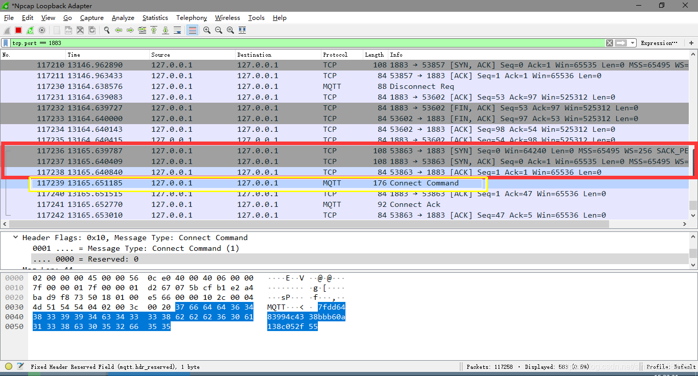 输出的信息我就不贴了, 全部空白, 没有任何消息, 我心想就奇怪了, tcp.port==1883 端口没错, 即使我没发信息, 应该有三次握手的信息吧, 找了好久wireshark的教程, 发现我也没配置错, 怎么就会没呢, 找了一天没找到, 就先放放没里了,
