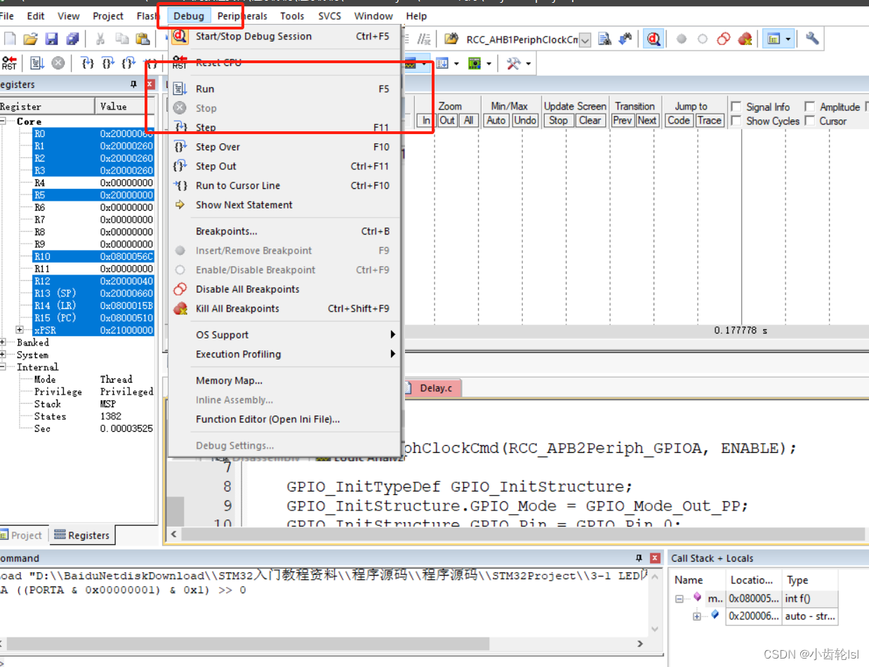 本文介绍了如何通过软件模拟仿真进行调试,步骤包括设置调试模式、添加检测变量或信号(如PA0),以及使用逻辑分析仪观察和运行程序,以获取仿真结果。