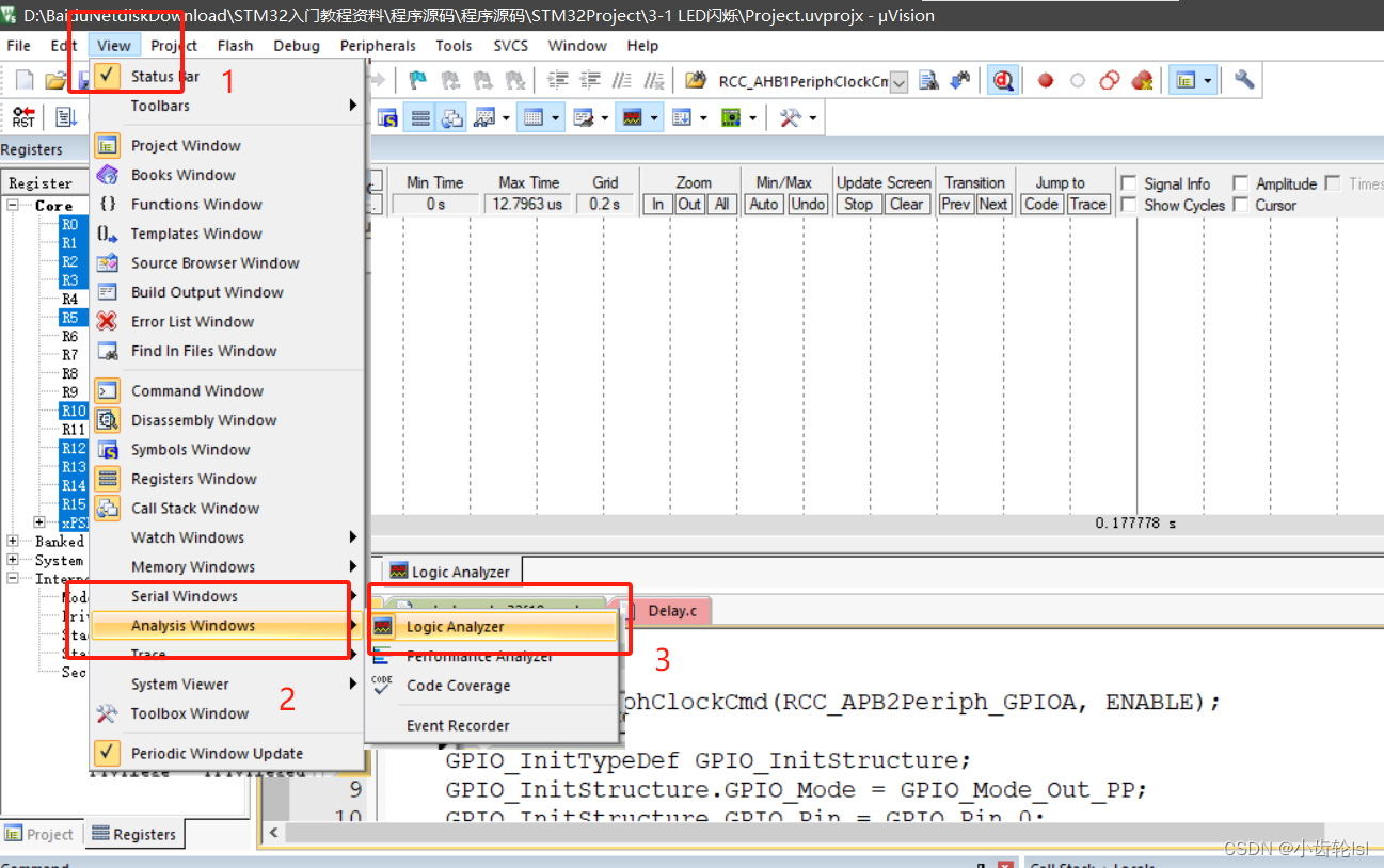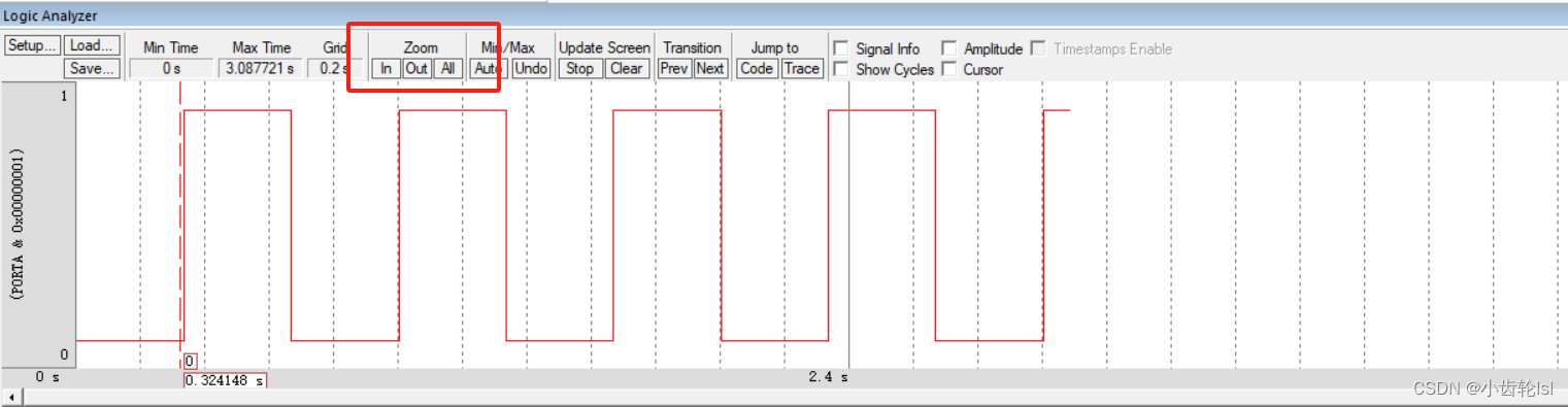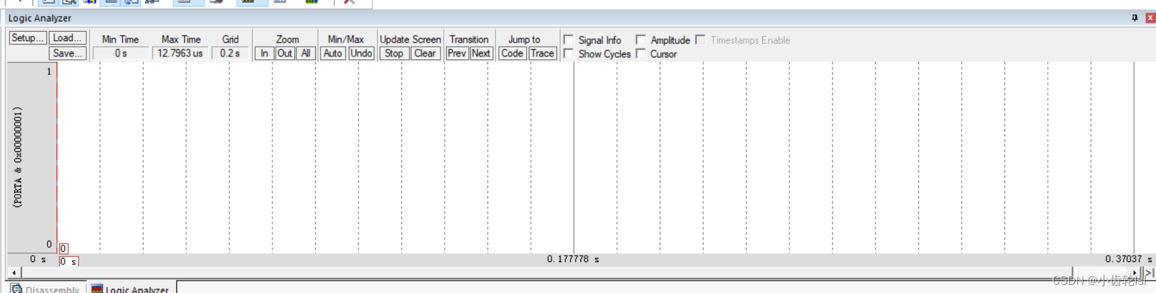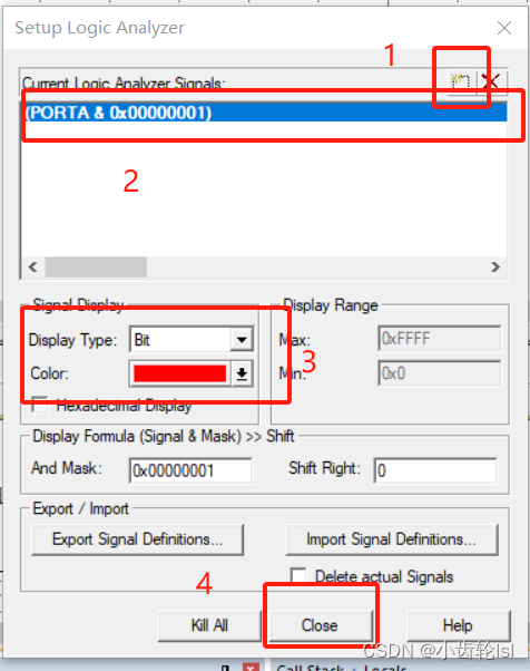 单击逻辑分析仪窗口Setup按钮,按如下操作,在2中新添加的信号添加你要观测的IO口,我观测的是PA0,故写PORTA.0,按照所需写就可以。