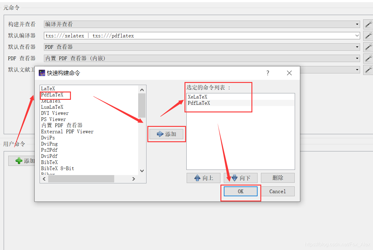 (4)选中PdfLaTeX后点添加,PdfLaTeX就会被添加到右边,然后点OK,然后重新编译tex文件即可完成字体加粗~