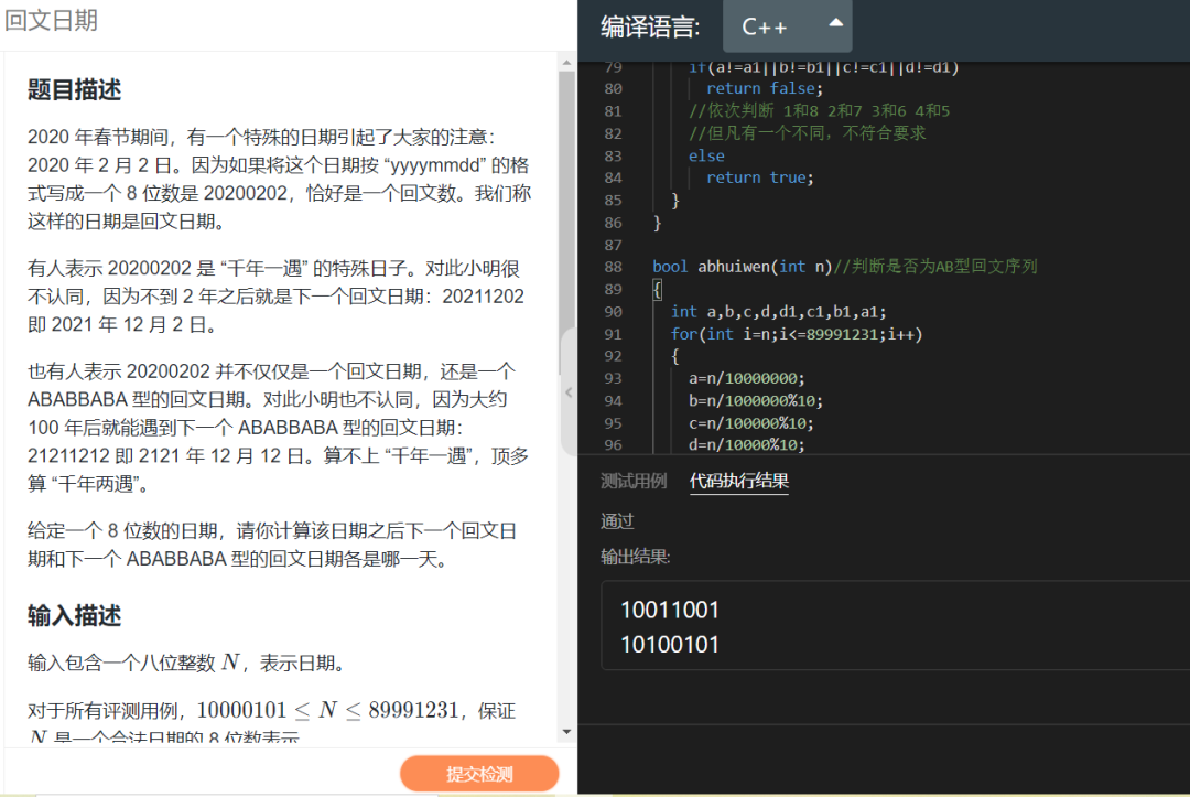 2020 年春节期间,有一个特殊的日期引起了大家的注意:2020 年 2 月 2日。因为如果将这个日期按 “yyyymmdd” 的格式写成一个 8 位数是 20200202,恰好是一个回文数。我们称这样的日期是回文日期。