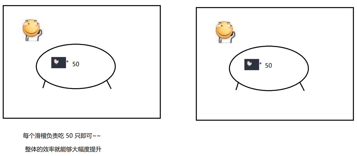 - 使用多线程 只增加 1名员工 此时同上 也是每个员工吃50份鸡腿 提高效率 并且节省 房间 圆桌的开销