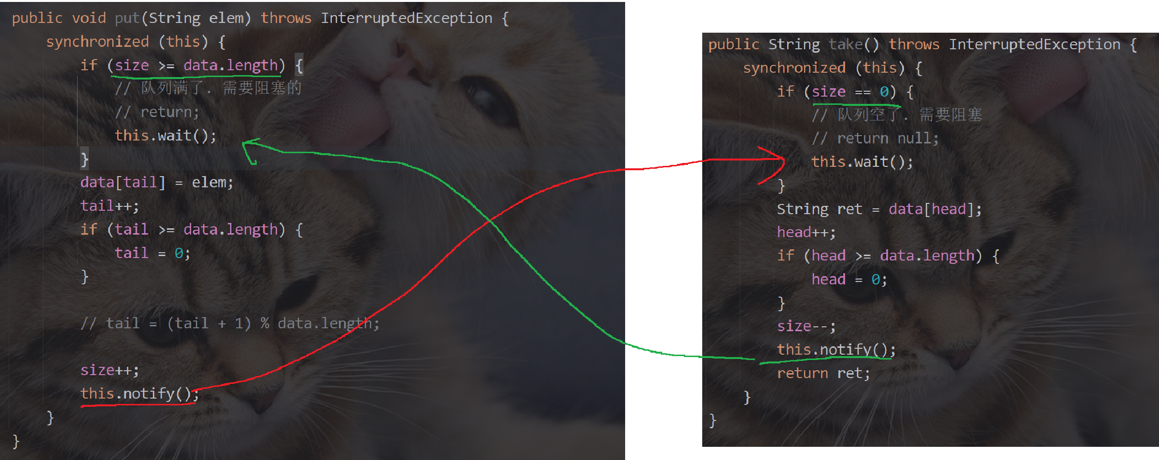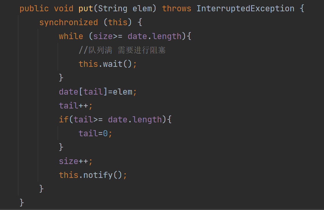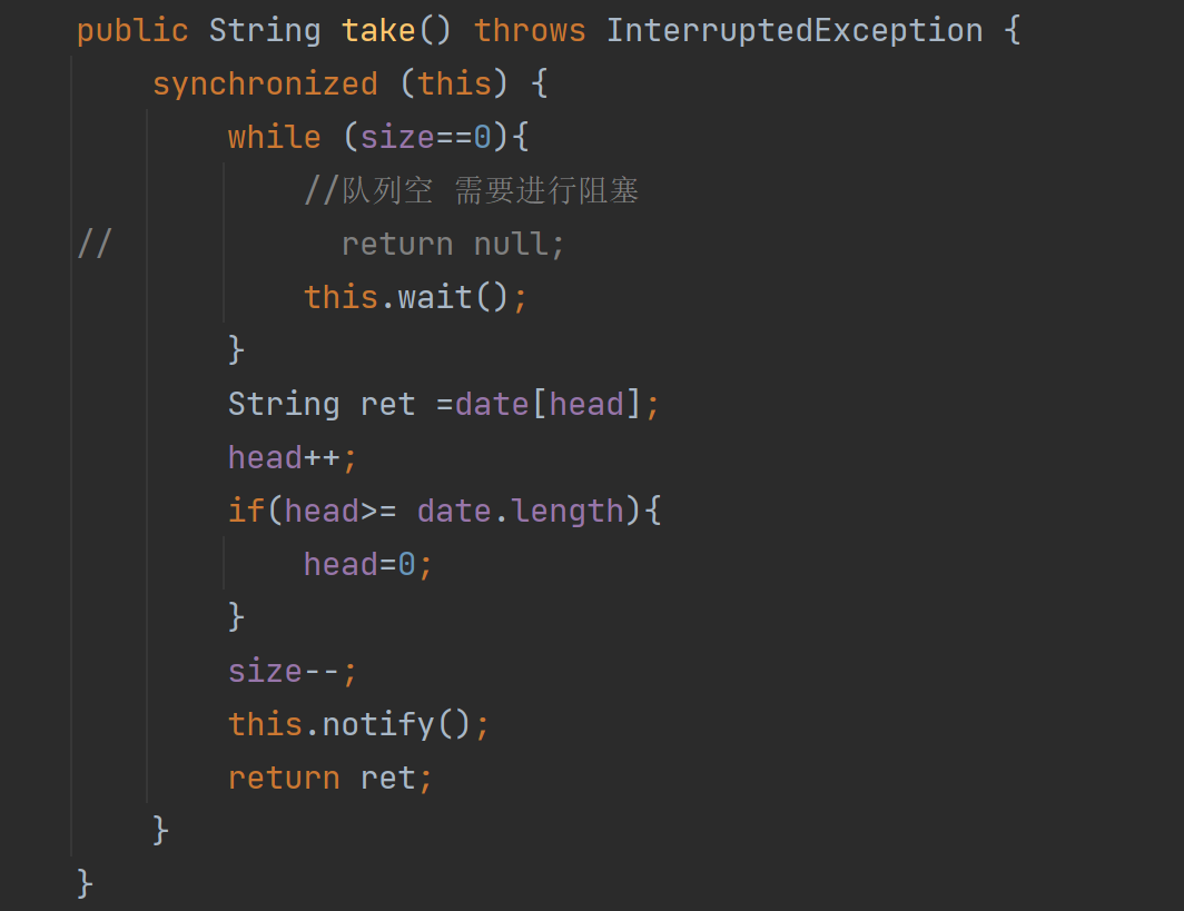 take中 this.wait() 当队列不空时 才进行唤醒——即其他线程成功执行put